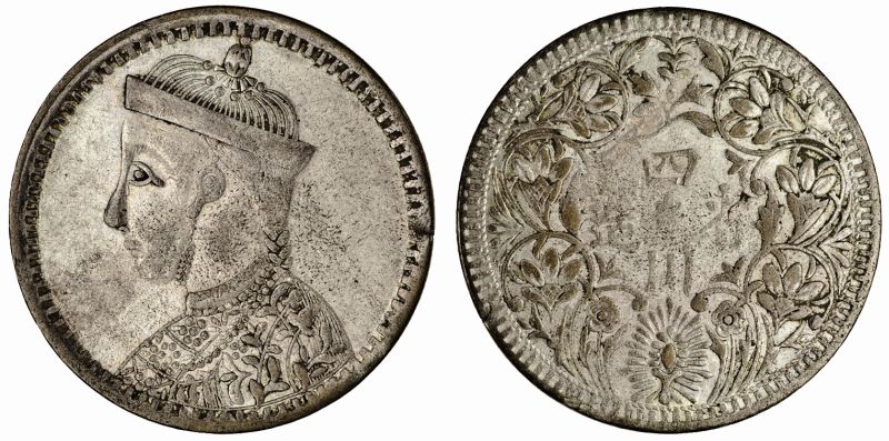 China, issued for Tibet, Sichuan Rupee, 9.51g, undated, large head with collar, string of pearls below the collar is composed of 13 pearls, rev. vertical rosette, without leaf in northeast position (YZM 480-484; KM. Y #3b), fine