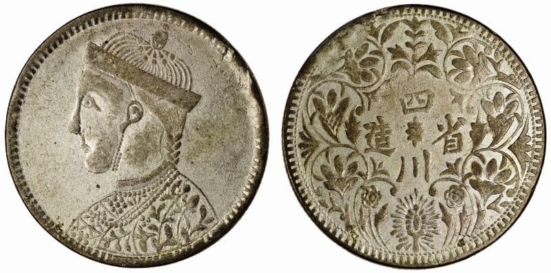 China, issued for Tibet, Sichuan Rupee, 12.16g, undated, large head with collar, string of pearls below the collar is composed of 14 pearls, rev. vertical rosette, without leaf in northeast position (YZM 480-484; KM. Y #3b), very fine