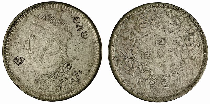China, issued for Tibet (1930-35), Sichuan Rupee, 11.01g, undated, countermark "5" in rectangular depression and "one" (Gabrisch and Bertsch, E and A. Wang Chun Li: "Illustrated Catalogue of Chinese Gold & Silver Coins; 1791-1949" (Zhong guo jin yin bi mu lu), Zhong guo shang ye chu ban she (China Trade Publishing House), Beijing 2012, p. 200, no. WS0768), on type with small head with collar, flat nose, string of pearls below the collar is composed of 15 pearls, rev. vertical rosette, without leaf in northeast position (YZM -; KM -), about fine, countermark "one" rare