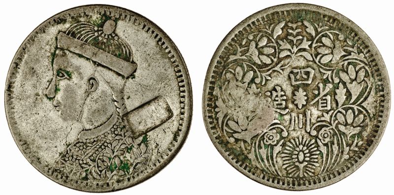 China, issued for Tibet (1936-42), Sichuan Rupee, 11.06g, undated, rectangular countermark which cannot be read, but may be a variant of the mark "li yong lam" on type with large head with collar, string of pearls below the collar is composed of 13 pearls, rev. vertical rosette, without leaf in northeast position (YZM - ; KM -), fine