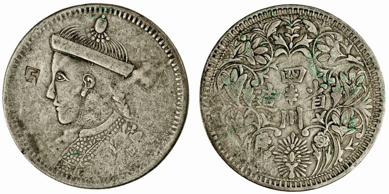 China, issued for Tibet (1936-42), Sichuan Rupee, 10.88g, undated, countermark "5" (Gabrisch and Bertsch, E), on type with large head with collar, string of pearls below the collar is composed of 13 pearls, rev. vertical rosette, without leaf in northeast position (YZM 496; KM -), fine and scarce