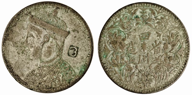 China, issued for Tibet (1936-42), Sichuan Rupee, 10.55g, undated, countermark "3" (Gabrisch and Bertsch, C), on type with large head with collar, string of pearls below the collar is composed of 14 pearls, rev. vertical rosette, without leaf in northeast position (YZM 493; KM -), some verdigris, fine, countermark rare