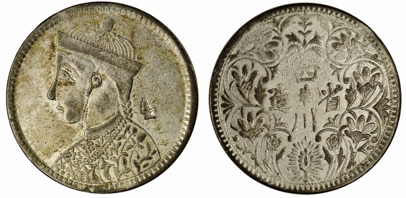 China, issued for Tibet (1936-42), Sichuan Rupee, 10.75g, undated, countermark "4," on type with large head with collar, string of pearls below the collar has 13 pearls, rev. vertical rosette, without leaf in northeast position (YZM -, KM -), obverse beautifully struck very fine, countermark very rare