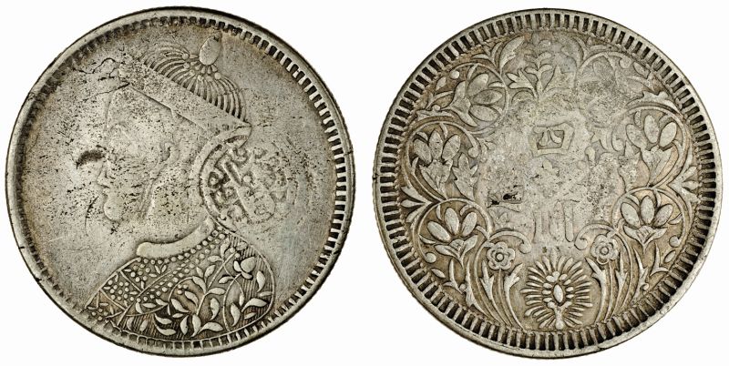 China, issued for Tibet (1936-42), Sichuan Rupee, 10.98g, undated, round countermark "rnam" in Tibetan script, this a modern fabrication, probably punched in Northern India with a Tibetan iron seal (Gabrisch and Bertsch, 5), on type with large head with collar, string of pearls below the collar is composed of 14 pearls, rev. vertical rosette, without small leaf in northeast position (YZM -; KM -), the host coin genuine, about very fine