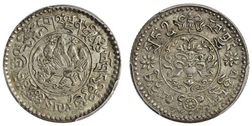 Tibetan Government, Anonymous, 1½-Srang, 6.01g, Trabshi mint, T.E.16-20 (1946), as previous lot, rev. legend: rab byung bcu drug lo nyi shu srang 1/5 ("cycle sixteen, year twenty, 1½-Srang") (YZM 512; KM. Y#24; LM 660A), in PCGS holder, graded AU58, rare date