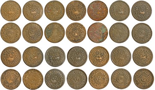 Tibetan Government, Anonymous, AE 1-Sho (14), Mekyi mint, T.E.15-52 to T.E.16-2 (1918-1928), complete date set of obverse type "lion looking backwards," including variants of date 15-55 (2) and 15-57 (3), rev. without bead in arabesques (YZM 725-735; KM. Y #21.1a), fine to very fine (14)