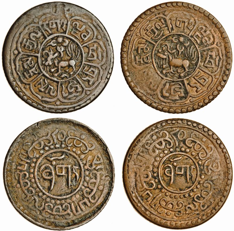 Tibetan Government, Anonymous, AE 1-Sho (2), Dode mint, T.E.15-54 (1920), the first with error date 51-54, the second with rev. legend rab byung lo 15 (plus weakly struck figure 54 instead of usual date), both lion looking upwards, rev. bead in arabesques (YZM 746-748), fine and very scarce (2)