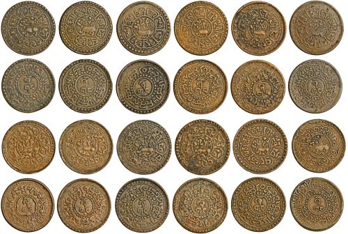 Tibetan Government, Anonymous, AE 1-Sho (12), Dode mint, T.E.15-56 to T.E.16-2 (1922-1928), complete date set "lion looking upwards" type, rev. legend zho gang arranged vertically in centre, including variants of dates 15-56, 15-57 & 15-60 (YZM 771-781, 785-787, 789-790 &792; KM. Y #21a), one of the 15-57 coins with clashed reverse die (part of the obverse legend is visible on reverse), fine to very fine (12)