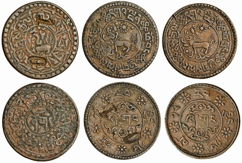 Tibetan Government, Anonymous, AE 1-Sho (3), Dode Mint, "lion looking up," punched with figure 10, rev. bead in arabesques; Trabshi mint, 16-11, also punched with figure 10 on reverse, Trabshi mint, 16-12, with small arrow as secret mark on reverse (the first KM. Y # 21.2; the last YZM 816-817), fine to very fine, the last scarce (3)