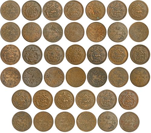 Tibetan Government, Anonymous, AE 5-Sho (20), Trabshi Mint, T.E.16-21 to 16-24 (1947-1950), a complete date set of this type with two suns above the mountains, including date 16-21 (2), rev. date over-strikes: 16-23 with "3" cut into figure below, 16-24 with "4" cut into figure below, all varieties between 16-22 and 16-24 with or without dot after "16" (at start of second line of script) are represented (YZM 838, 840-845; KM Y# 28.1), very fine to extremely fine (20)