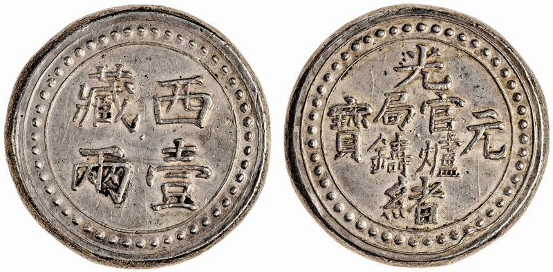 China for Tibet, Anonymous (c. 1908), 1-Tael, 36.21g, undated, inscription (to be read from right to left) xi zang yuan Liang (Tibet, one Liang) (Kann 441), about extremely fine and rare