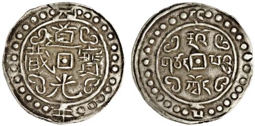 Tibet, Dao Guang, 1-Sho, 3.66g, 1st year, 26 beads, 13 both sides of date, rev. 28 beads, 14 both sides, legends as before (YZM 203-207; KM. C#93; LM 647var), good fine and scarce