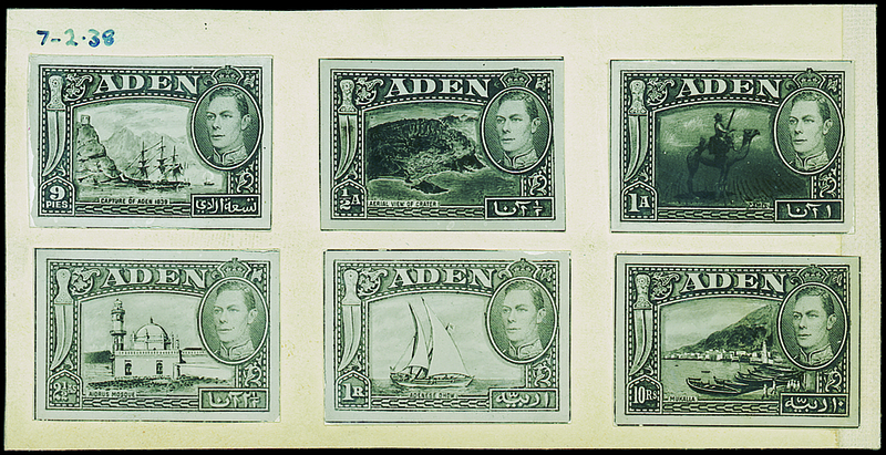 1938 (7 Feb.) six unadopted designs; also 1953 (25 Mar.) Aden Colony Inland Revenue 1/-. Photo