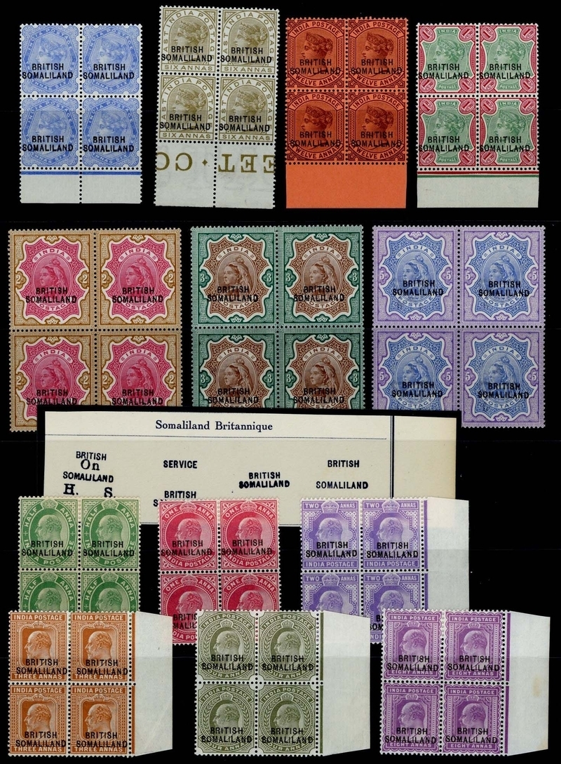 2½a. to 5r. and King Edward VII ½a. to 8a., the set of thirteen in fresh mint blocks of four with eight anna values marginal; fine. Also Fournier forgery piece showing impressions of two Postage and two Official overprints. S.G. 18-30, £1,600+