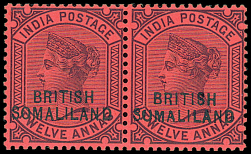 12a. purple on red horizontal pair, the right-hand stamp with variety "sumaliland", upper pane, Row 2/9 with only 34 possible. S.G. 20, 20b, £325. Photo
