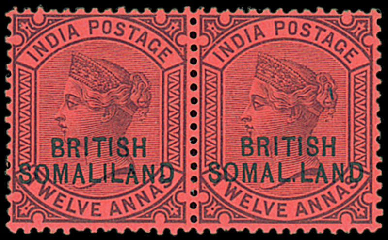 12a. purple on red horizontal pair, the right-hand stamp with variety "somal.land", fresh lightly mounted mint. S.G. 20, 20c, £375. Photo