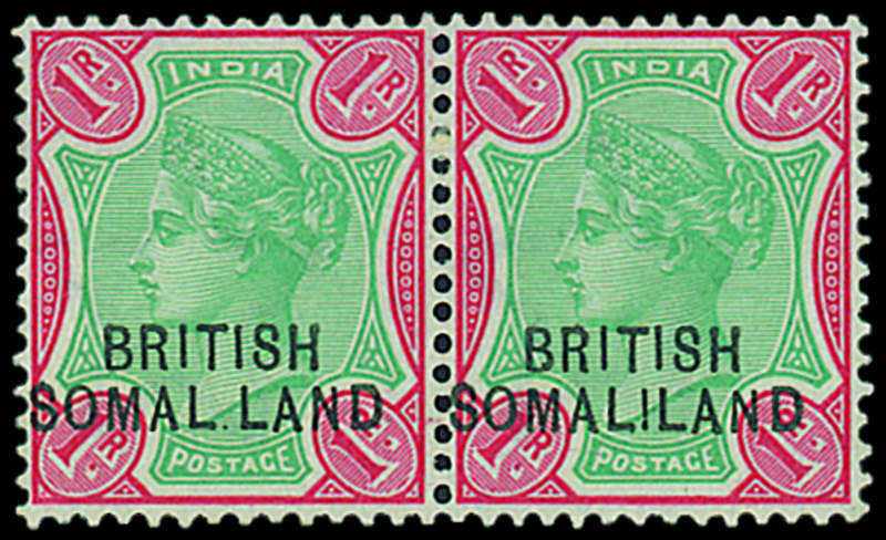1r. green and aniline carmine horizontal pair, the left-hand stamp with variety "somal.land", fine mint. S.G. 21, 21c, £475. Photo