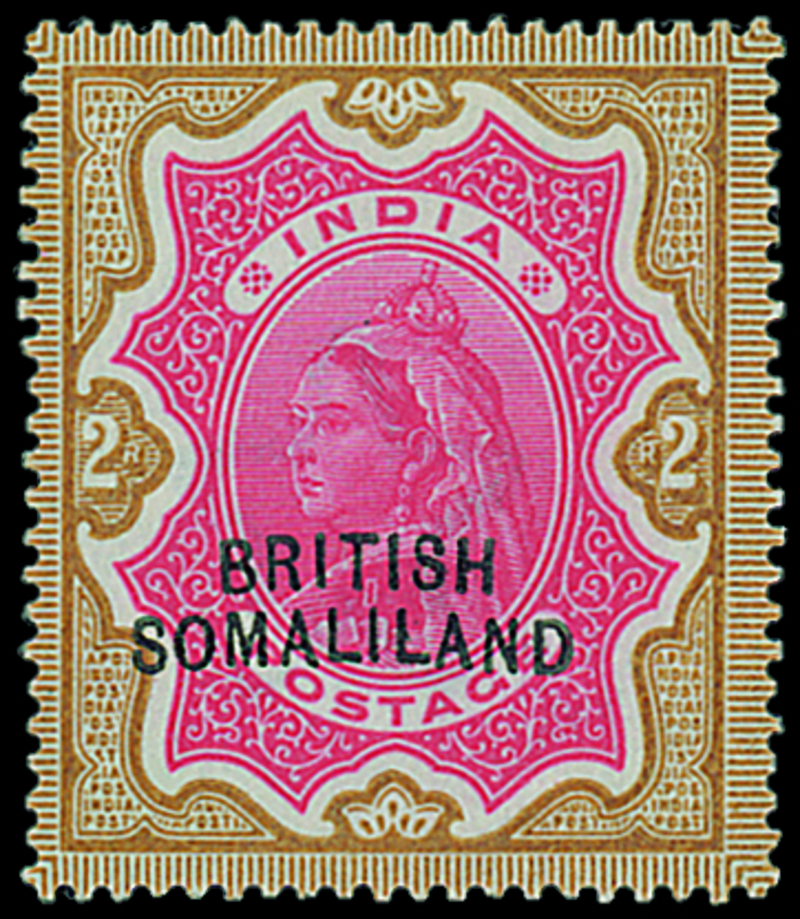 2r. carmine and yellow-brown, variety curved overprint, right pane, Row 3/4 with a maximum of 18 possible fine mint. Scarce. S.G. 22a, £850. Photo