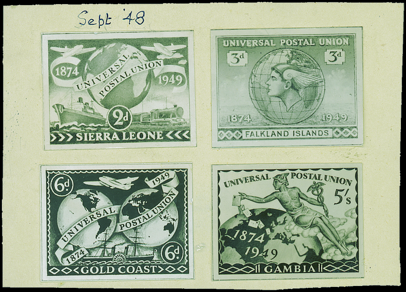 1948 (Sept.) U.P.U. set comprising Falkland Islands 3d., Gambia 5/-, Gold Coast 6d. and Sierra Leone 2d, all unadopted designs. Photo