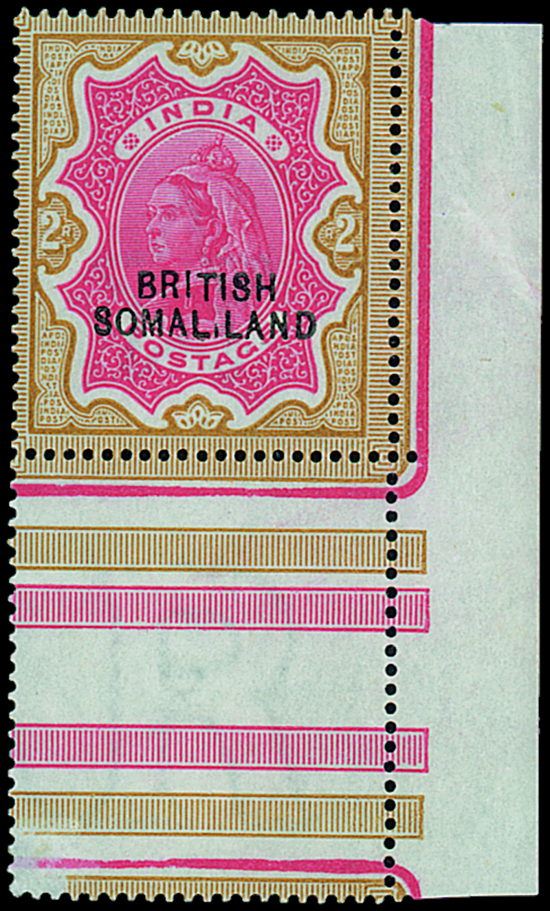 2r. carmine and yellow-brown lower right corner example with interpanneau pillars margin at foot, variety "somal.land", 6th pane, Row 3/4, fresh mint. Scarce. B.P.A. Certificate (2007). S.G. 22c, £850. Photo