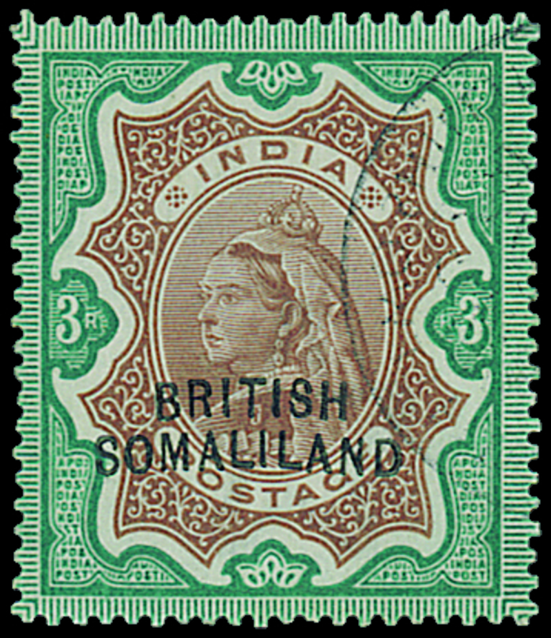 3r. brown and green, variety curved overprint, used with part c.d.s. at right; fine and very rare thus. Signed Holcombe. S.G. 23b, unpriced used. Photo