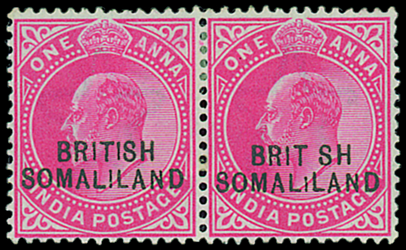 1a. carmine horizontal pair, the right-hand stamp with variety "brit sh" and short "i" in "somaliland", part original gum; sound. S.G. 26a, £325. Photo