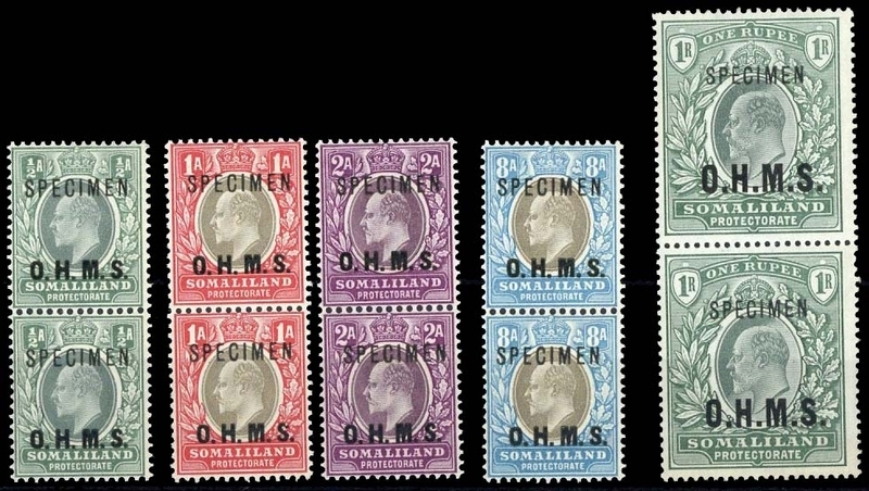 ½a. to 1r. set of five in vertical pairs, overprinted "specimen", fresh unmounted mint. Scarce multiples. S.G. O10-13, 15, £300+
