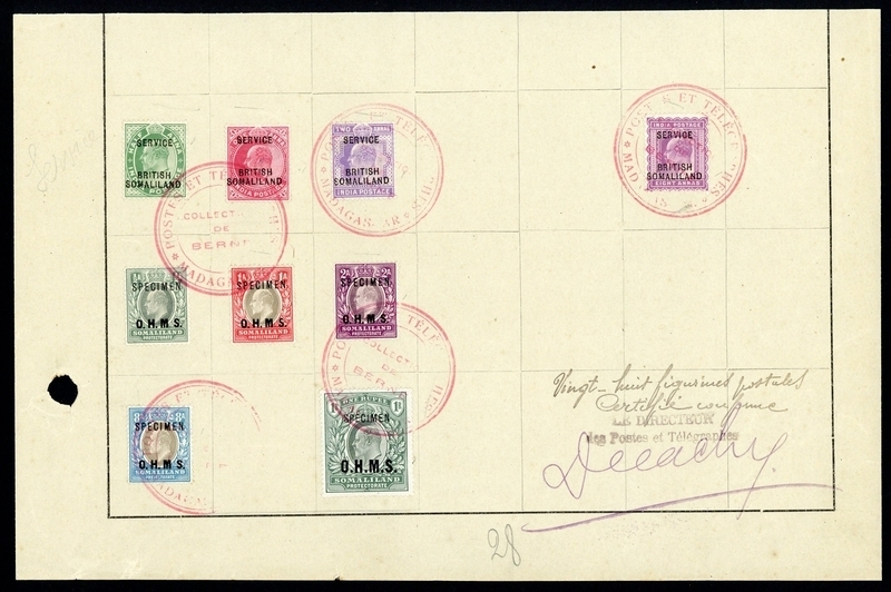 ½a. to 1r. set of five, the ½a. to 8a. each showing stop after "m" virtually missing, overprinted "specimen" and 1903 ½a. to 8a., neatly cancelled by "postes et telegraphes/collection/de/berne/madagascar" handstamp in red and affixed to piece signed by the Director of Posts & Telegraphs. A fine and unique item from the folio pages of the Madagascar Director of Posts archive. Photo