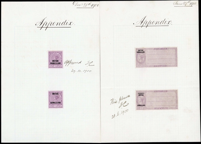 Court Fee 1a. (2) with differing styles of overprint, affixed to 1900 (27 June) Appendix sheet with that selected marked "This please", initialled and dated "28.6.1900", and Revenue 1a. (2) with differing styles of overprint, affixed to 1900 (28 Dec.) Appendix sheet with that selected marked "Approved", initialled and dated "29.12.1900". A fine and unique pair. Photo