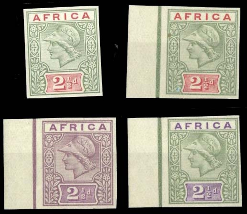 2½d. in green and red, green and violet and dull mauve and violet, all marginal on unsurfaced paper, and 2½d. in green and red on chalk-surfaced paper; the first with a small brown mark, otherwise fine
