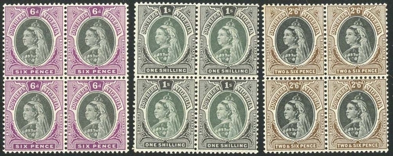 ½d. to 2/6d. blocks of four, fresh mint with only one stamp in each lightly hinged and one in each with a light pencil annotation. A fine and scarce group. S.G. 1-7, £278+