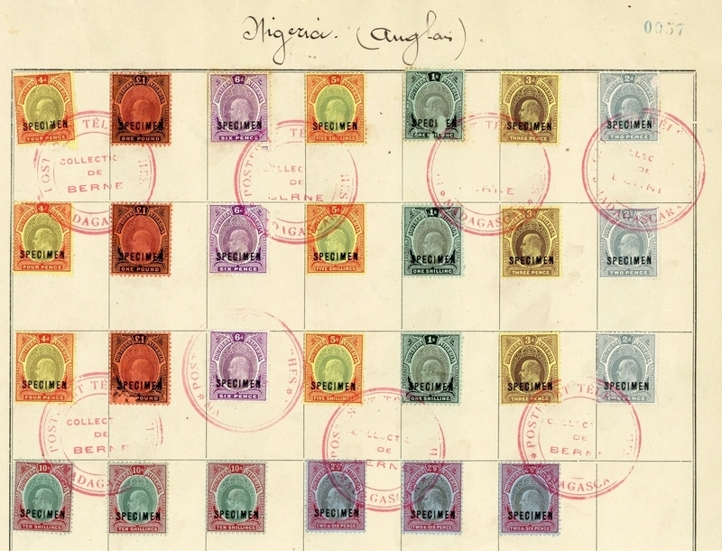 1904-09 2½d. (2), 3d. (5) and 1907-11 ½d. (5), 1d. (5), 2d. (3), 2½d. (5) and 3d. to £1 (three of each), each overprinted "specimen" and tied on three ledger pages (one a top half only) cancelled with strikes of the "postes et telegraphes/collection/de/berne/madagascar" handstamp in red; three with surface faults though colourful and a unique group