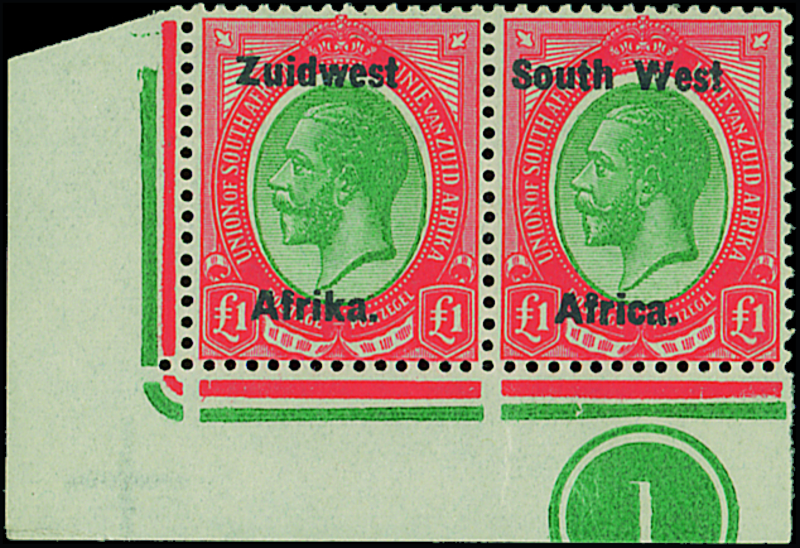 £1 green and red (July 1923 bold lettering) lower left corner pair with plate number "1", variety shifted medallion (new moon), fresh deep colours and lightly mounted mint. Briefmarkenprüfstelle Certificate (2013) states "A rare variety that I have not seen before". S.G. 27 var. Photo