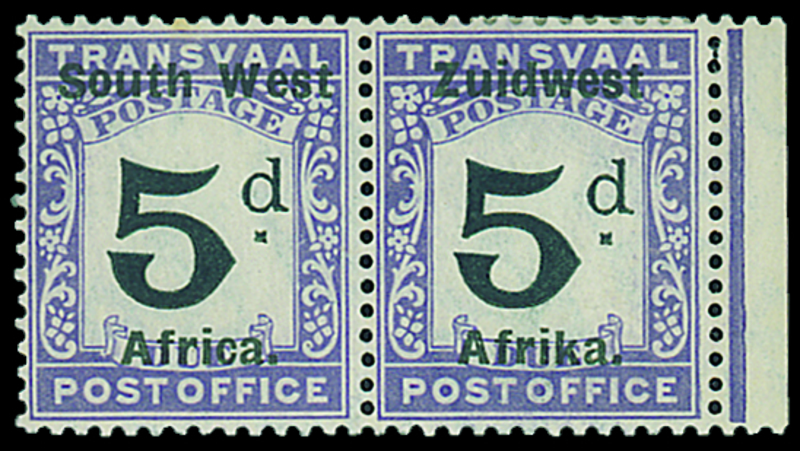 1923 (Jan.-July) Setting IV on Transvaal, 5d. horizontal marginal pair, large part original gum; light fox mark at top of one, otherwise fine. Scarce. S.G. D17a, £850. Photo