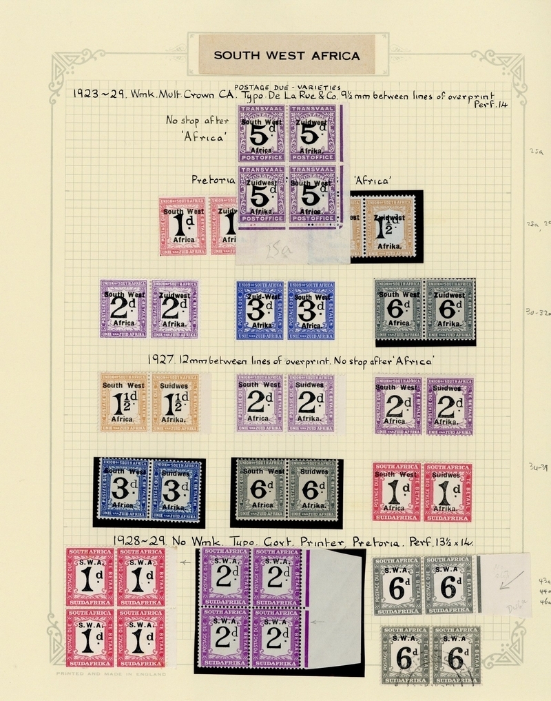 1923-26 Setting VI on Transvaal, 5d. lower right corner block of four and on South Africa 1d. to 6d. horizontal pairs, one in each showing variety no stop after "Afrika", and 1928-29 on 1927-28 South Africa 1d. and 2d. blocks of four and 6d. pair with one in each showing no stop after "a", and a 6d. used pair (scarce) with the same variety; also 1927 (May-Sept.) on South Africa 1d. to 6d. and 2d. shade horizontal pairs with normal "Suidwes" overprint. Cat. £675+