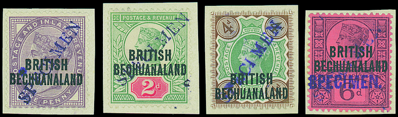 1891-94 1d., 2d., 4d. and 6d., each handstamped "specimen" (BEC2) diagonally and affixed to small piece, the 6d. additionally handstamped "specimen." (18x3mm.) in violet by an unknown authority. A unique group. Photo