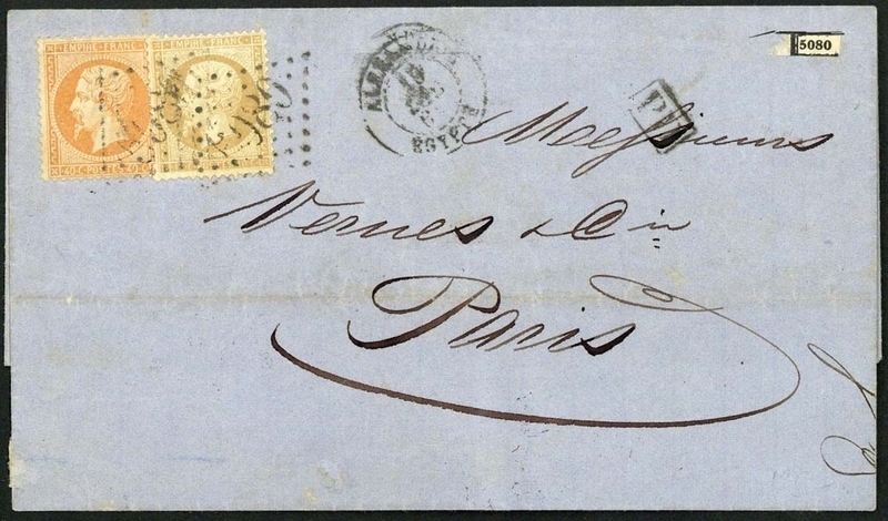 1864 (19 Dec.) entire to Paris bearing 1862 10c., 40c. with "5080" Gros chiffres cancellations and with Alexandrie/Egypte c.d.s. alongside; filing fold well clear of the adhesive, fine