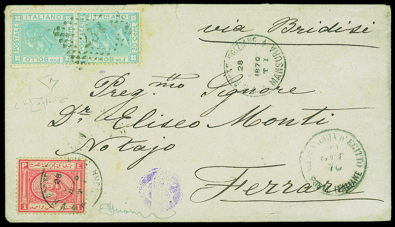 1870 (30 Dec.) envelope to Ferrara bearing Egypt 1867-71 1pi. dull rose with "v.r. poste egiziane mansoura/28/ott/70" cancellation, carried to Alexandria and there 1867 20c. blue, vertical pair, affixed and tied by "234" in lozenge of dots, "alessandria d'egitto/poste italiane" c.d.s. alongside, arrival datestamp on reverse; a few minor perimeter faults but a fine and scarce mixed franking. Signed Raybaudi and with E. Diena certificate (1990). Photo