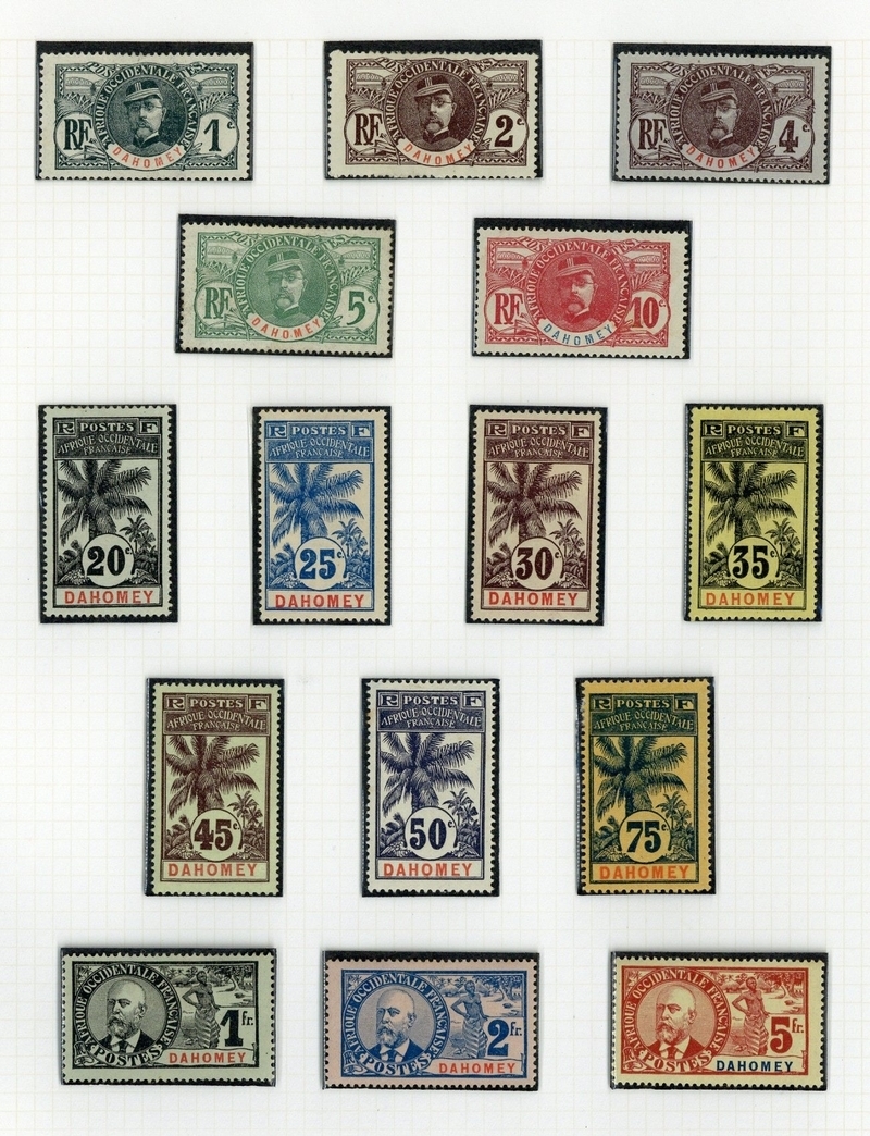 1890 (c.) -1931, a mostly mint collection arranged in two albums, contained in a carton, with some specialisation including overprints and strength in Dahomey 1899-1905 1c. to 5f., 1906-07 1c. to 5f., French Territory of the Afars and Issas with Djibouti 1894-1902 1c. to 50f. (25f. overprinted "s"), 1902 (4 Jan.-2 Feb.) 0.40 on 2f. (used), 1902 (26 Apr.-24 June) 10c. on 2f. variety "djibouti" inverted and French Somali Coast 1902-03 1c. to 5f., 1903 1c. to 5f., Gabon 1904-07 1c. to 5f., Guadeloupe and New Caledonia. S.t.c. Yvert €19,000+. Generally fair to fine. (hundreds)