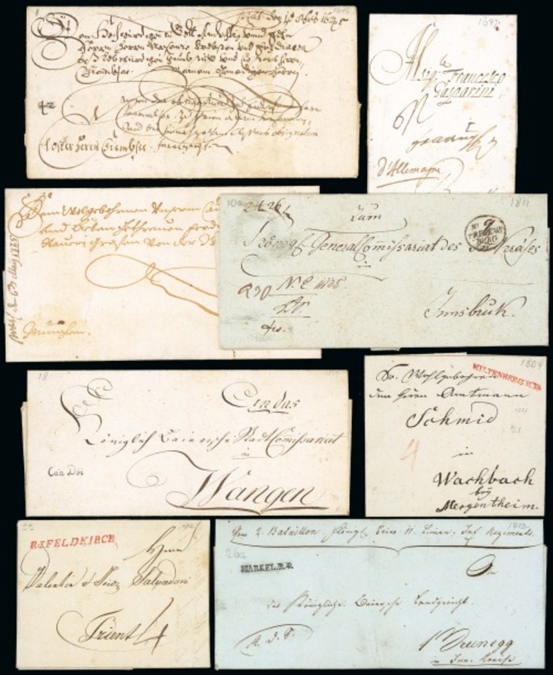 1645-1855, ninety-eight stampless entire letters, including 1645 without postal markings, 1697 from Munich to Brussels without markings, 1725 with disinfection slits, 1785 with "v.augspurg", 1799 with script "Von Munchen", 1804 with red "miltenburg r2", 1807 with script "Caa Doi", 1811 with oval "No/vRegens/burg", 1813 with "markel. r4.", 1813 with "braunau", Fingerhut (thimble) datestamps with "aibling", "aschaffenburg" (red), "feucht", "furth", "gunzenhausen", "hassfurth", "lauf", "neustadt", "pegnitz", "ramberg", "zettlinz", registered, semi-circular datestamps, etc., strikes and condition mixed but many fine to very fine and a most interesting group