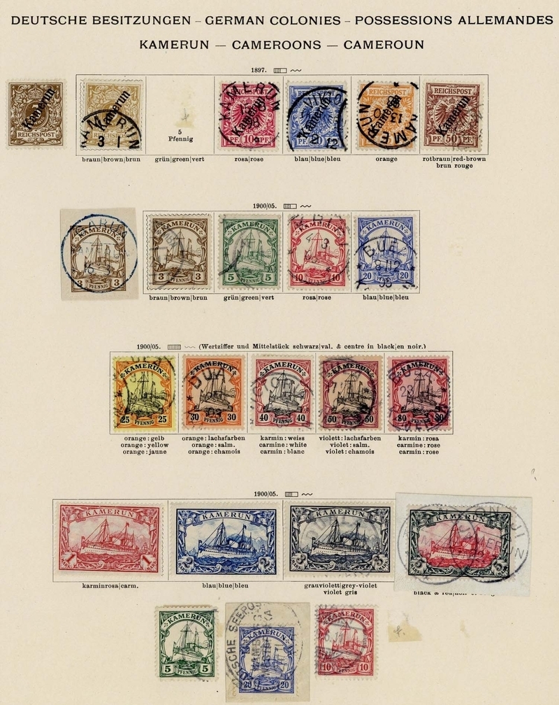 Collection on pages, thirty-six stamps, including 1897-98 3pf. grey-brown and yellow-brown shades, 25pf., 50f., 1900-11 5m, fine used on piece, 1905-19 to 5m., etc., chiefly fine
