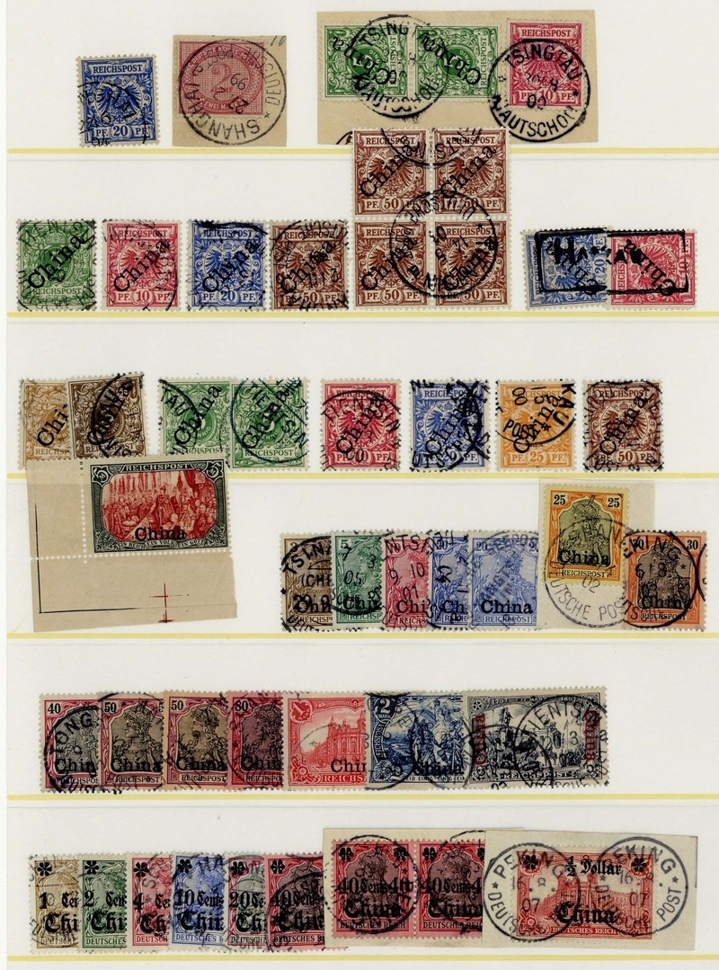 Collection on pages, sixty-one stamps, including forerunners with 1886-1901 2m., 1898 48 degree overprint 50pf. block of four, 56 degree overprint set, 1901 5m. type I hand painted borders, original gum from the lower left corner of the sheet, 1905 no watermark set, 1905-19 5m. fine used on piece, etc., chiefly fine