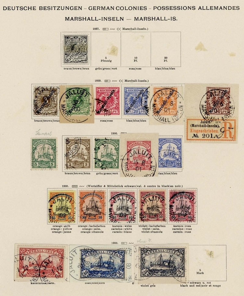 Collection on pages, thirty-two stamps, including 1897-1900 "Marshall" 3pf. to 50pf. used (50pf. on registered piece), 1901 1m., 2m. and 3m. fine used on pieces, 1916-19 5m., etc., chiefly fine