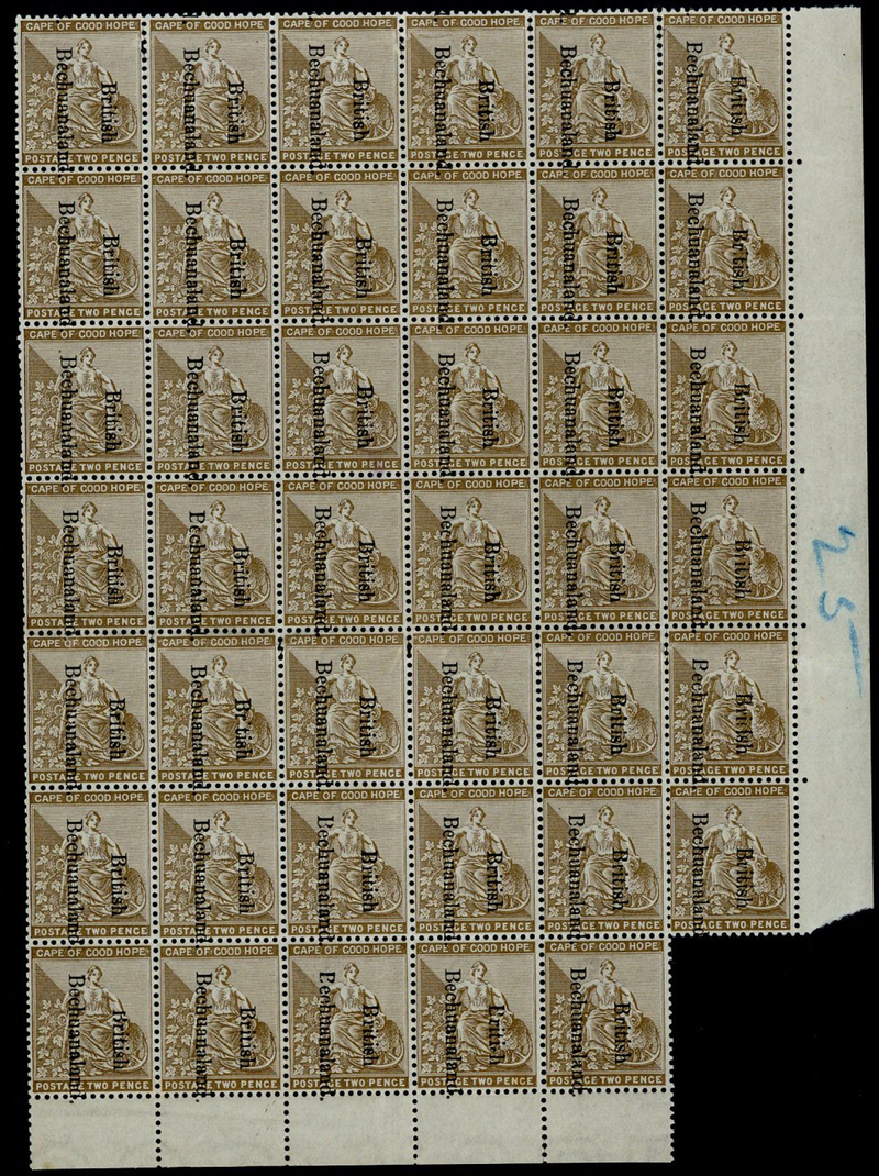 2d. pale bistre block of forty-one comprising the lower seven rows of the upper right pane (lacking the lower right corner stamp) with margins at foot and right, many with broken type including two with largely missing first "i" in "British", fresh unmounted mint; some creases as to be expected with a block of this size. A scarce and impressive multiple. S.G. 39