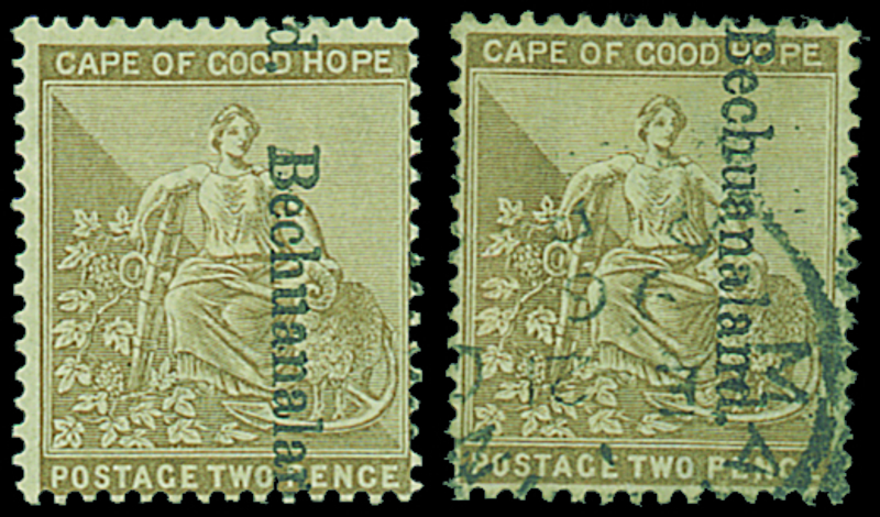 2d. bistre, variety "British" omitted with just a trace of "British" in perfs. at right, unused with part original gum, and a used example with part Mafeking c.d.s. S.G. 39b. Photo