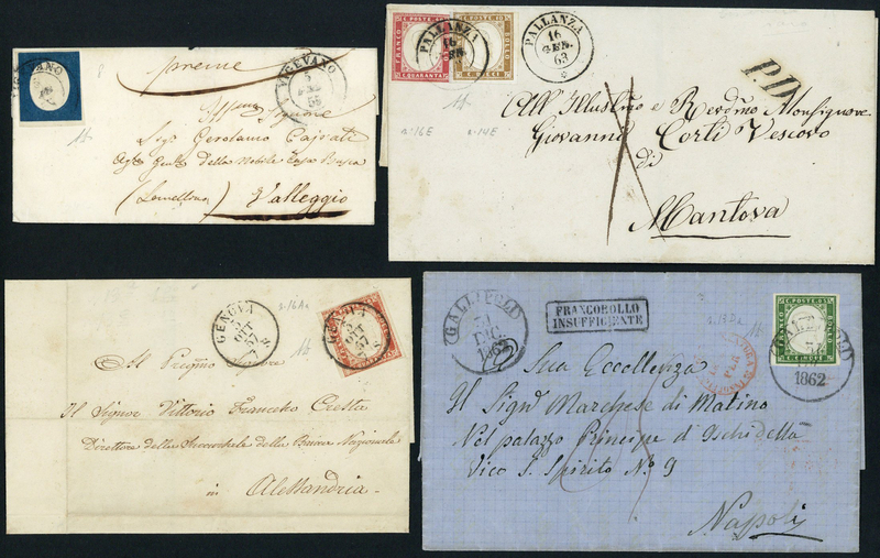 1855-63 selection of forty-two entires or entire letters and a front, including 1854 20c. blue and deep blue shades, 1855-63 5c. and 10c., three on entires, 10c. and 40c. on entire from Pallanza, 20c. and 40c. on 1857 envelope to Bristol, 40c. (uncancelled) on entire to Grenoble, 40c. on entire to Alessandria, etc., also 10c. mint block of ten; mixed condition