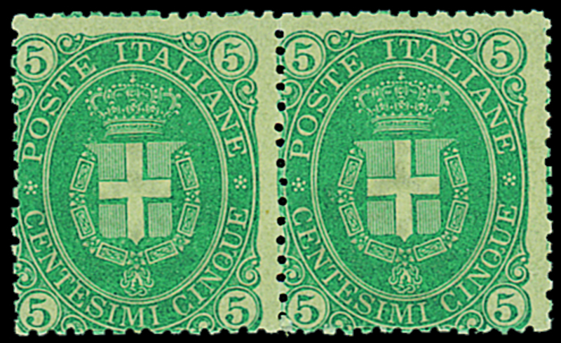 1889 Arms 5c. green, unmounted mint horizontal pair, good colour and perfs., pencilled signatures on the reverse, fine. Sorani Certificate (2007). S.G. 38, £2,000. Sassone 44, €2,500. Photo