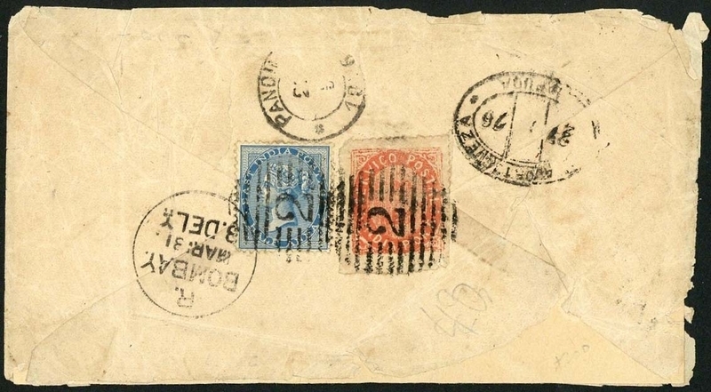 1876 envelope to Bombay bearing 20r. red in combination with India ½a. blue, "2" in barred circle cancellations and oval Mapuca datestamp, transit and arrival markings, faults but scarce. Photo