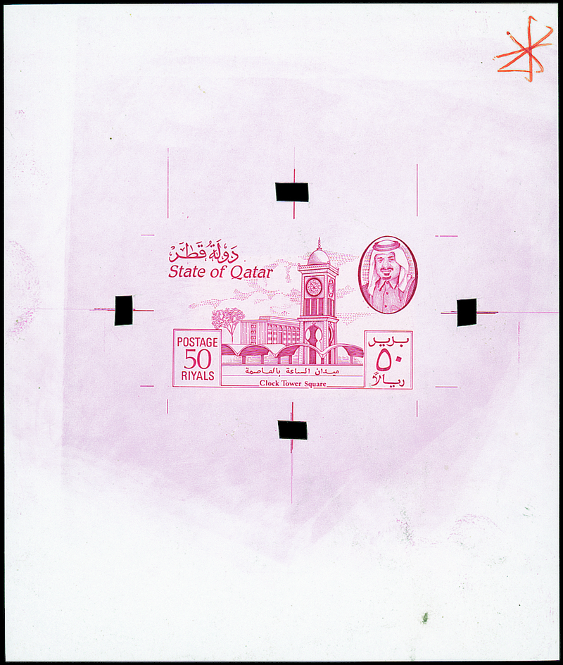 1973-74 (c.) 50r. unadopted die proof in maroon on glazed, gummed paper (99mm x 117mm), depicting Shaikh Khalifa in oval and Clock Tower Square, four punch holes over guide lines. Fine and most unusual. Photo