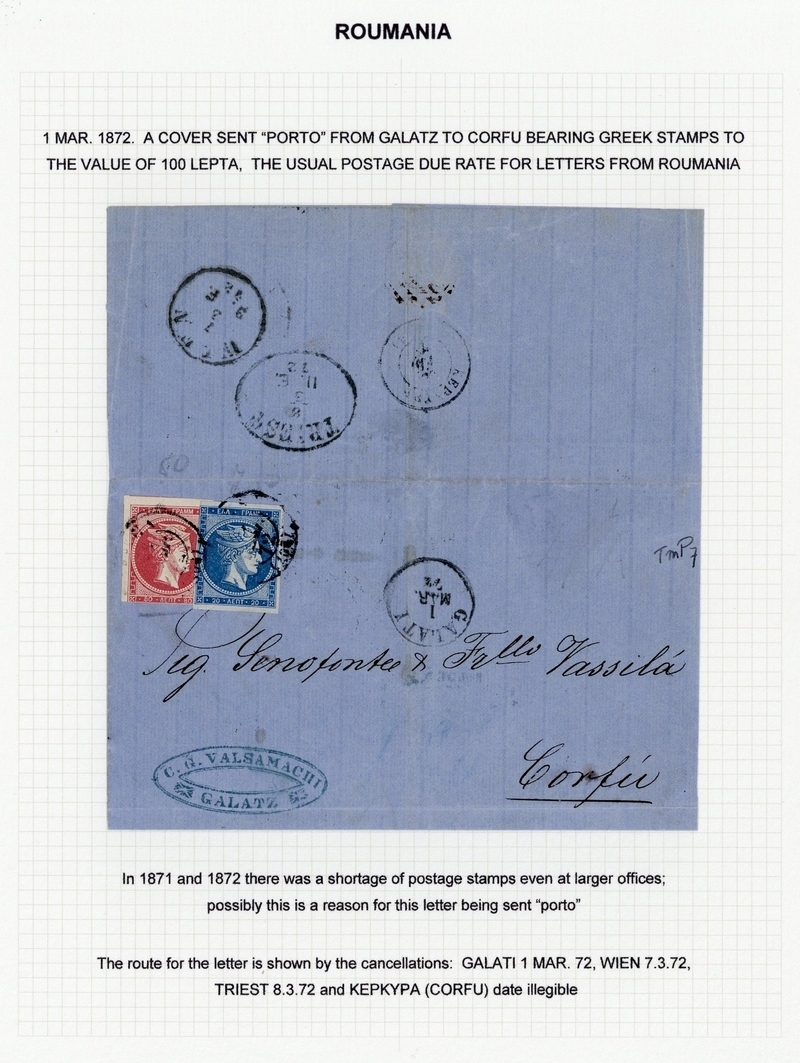 1865-71 nineteen stampless entires or postal forms, markings with Bucureschi, Cahul, Caracal, Focsani, Giurgiu, Iassi, Minzil, Piatra, Ploesti, Rimac Sarat, Roman, Tirgovistea, Tirgu, instructional markings, etc., also 1872 entire letter from Galatz to Corfu taxed by Greece 20L. and 80L. on arrival, etc., chiefly good to fine